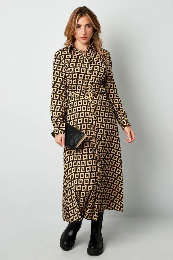 Hoe leuk is deze maxi-jurk met print? Een echte aanrader als je wil shinen met het koudere weer. De jurk heeft een bijpassende riem met gesp, een speels detail. De jurk is gemaakt van Polyester en komt in de maten S - M - L.