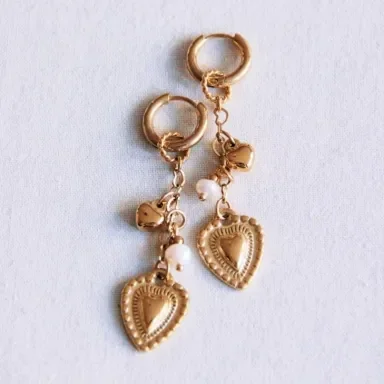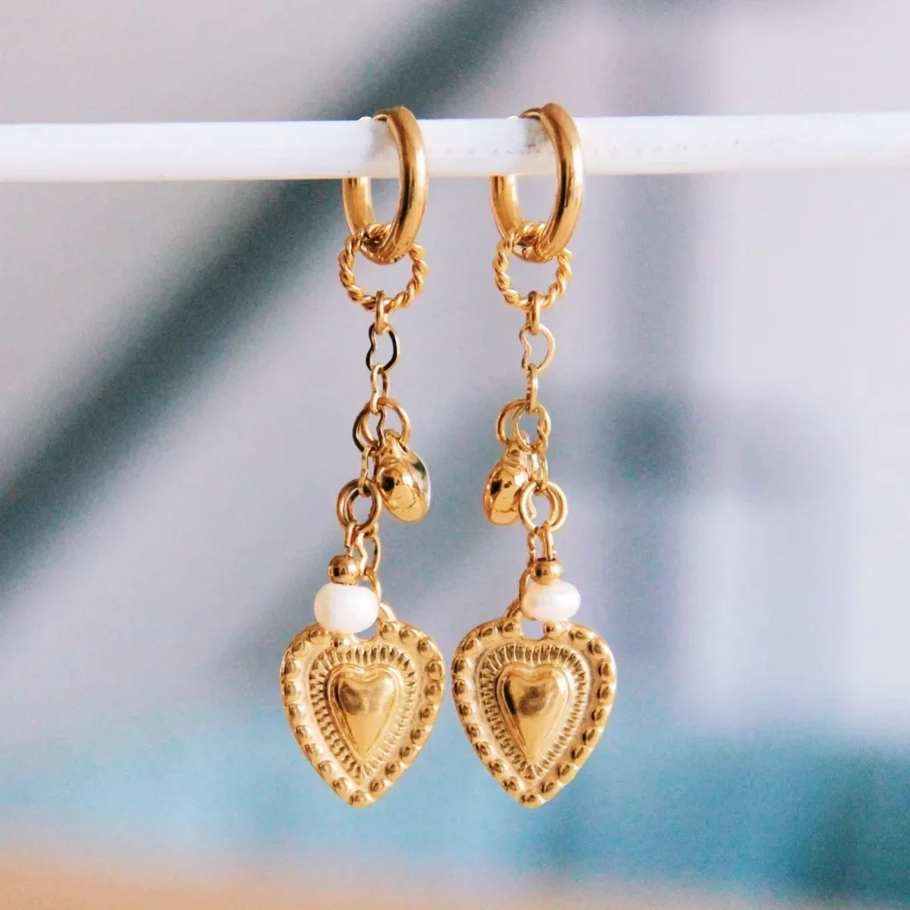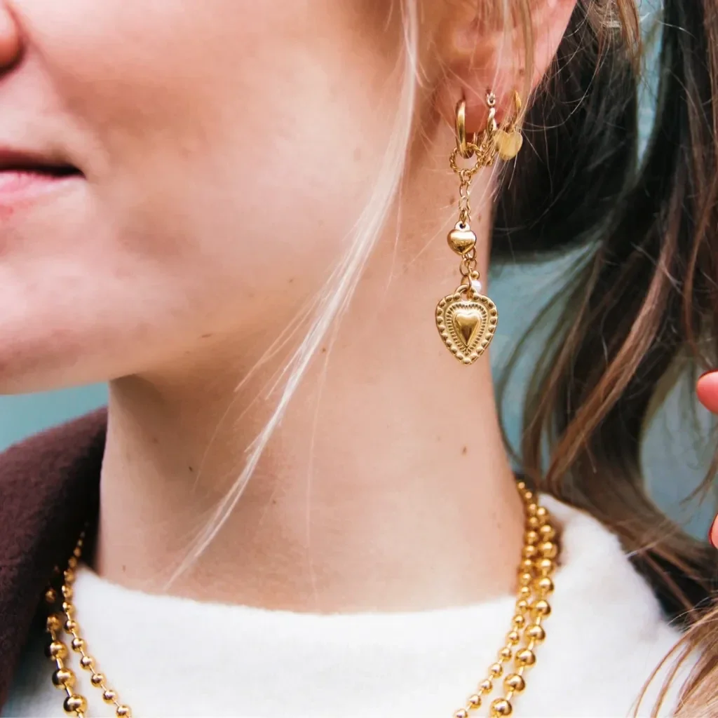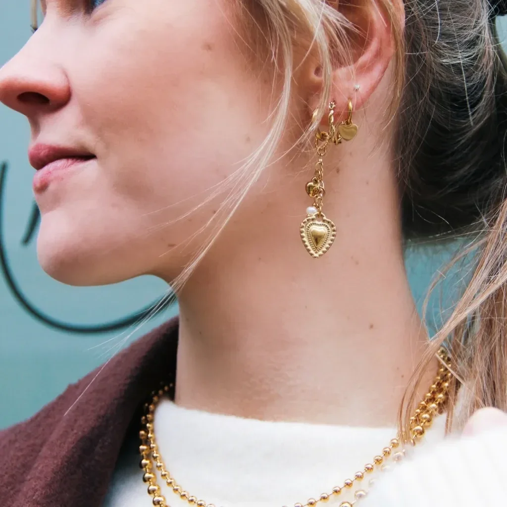 Met deze sierlijke draadoorbellen val jij gelijk op. Perfect om jouw basic look een extra touch te geven. Aan de draadoorbel hangen verschillende hartjes en parels. Scoor deze beauty’s snel!