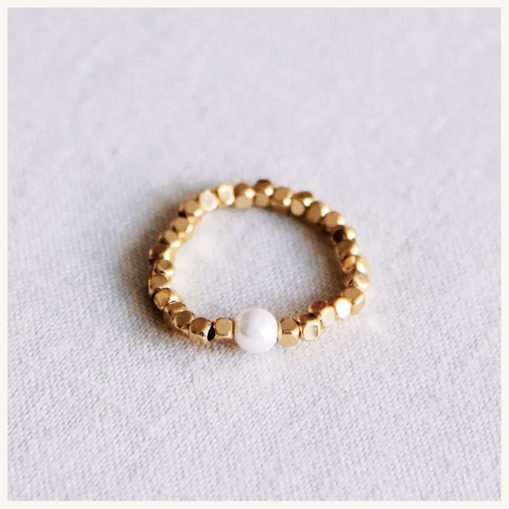 - Deze goudkleurige stalen ring is gemaakt van cubes in combinatie met een natuursteentje en is elastisch