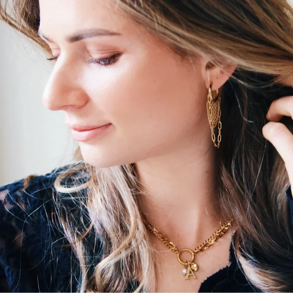We love deze stoere statement hoops! Deze mooie oorringen zijn een echte musthave. De oorring is voorzien van verschillende kettinkjes. Combineer de oorbellen met goudkleurige studs of andere oorringen en je earparty is helemaal compleet!